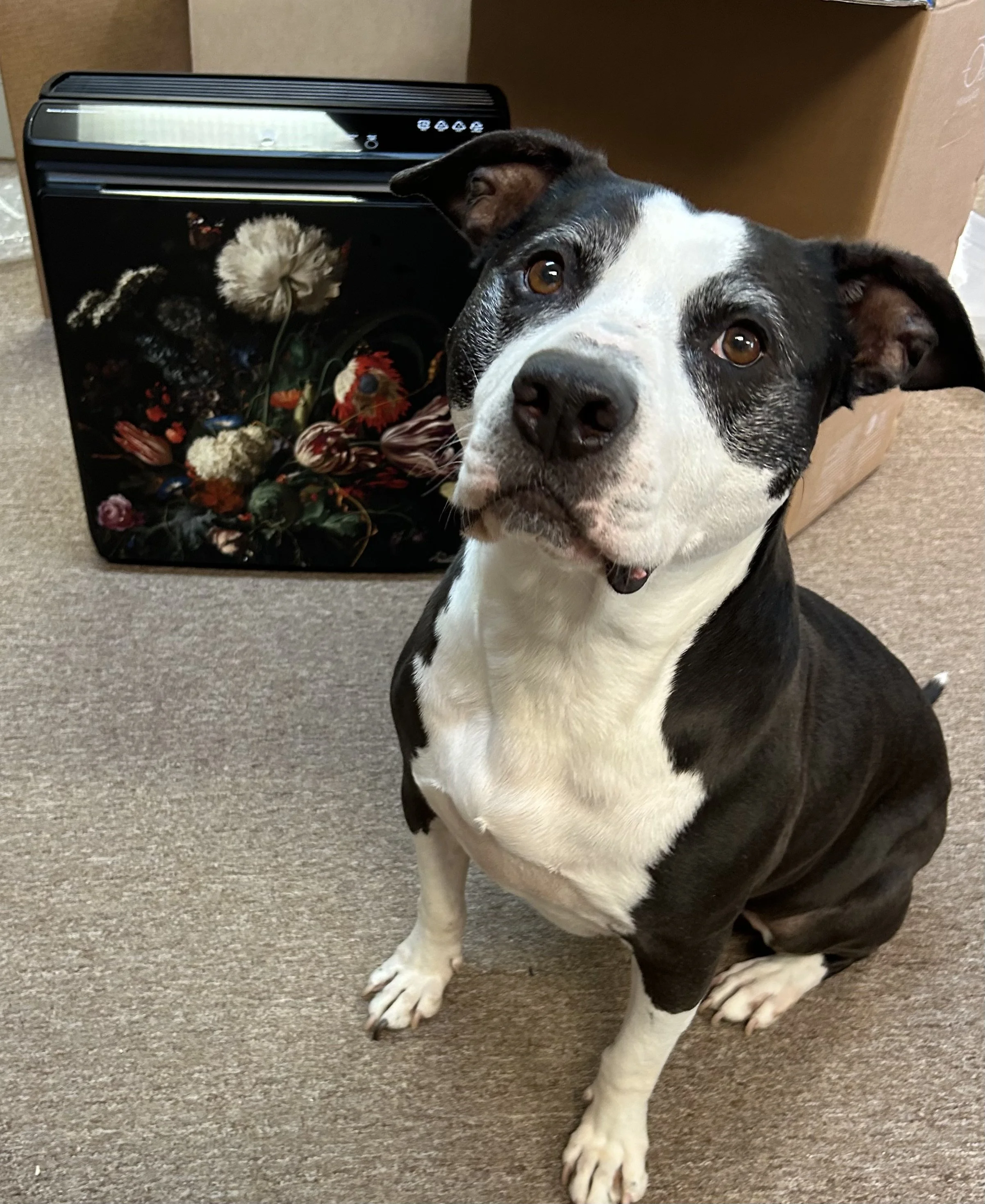The Rabbit Air A3 Purifier is Great for People with Pets! Image of purifier and my pup Chops by Kat Brancato