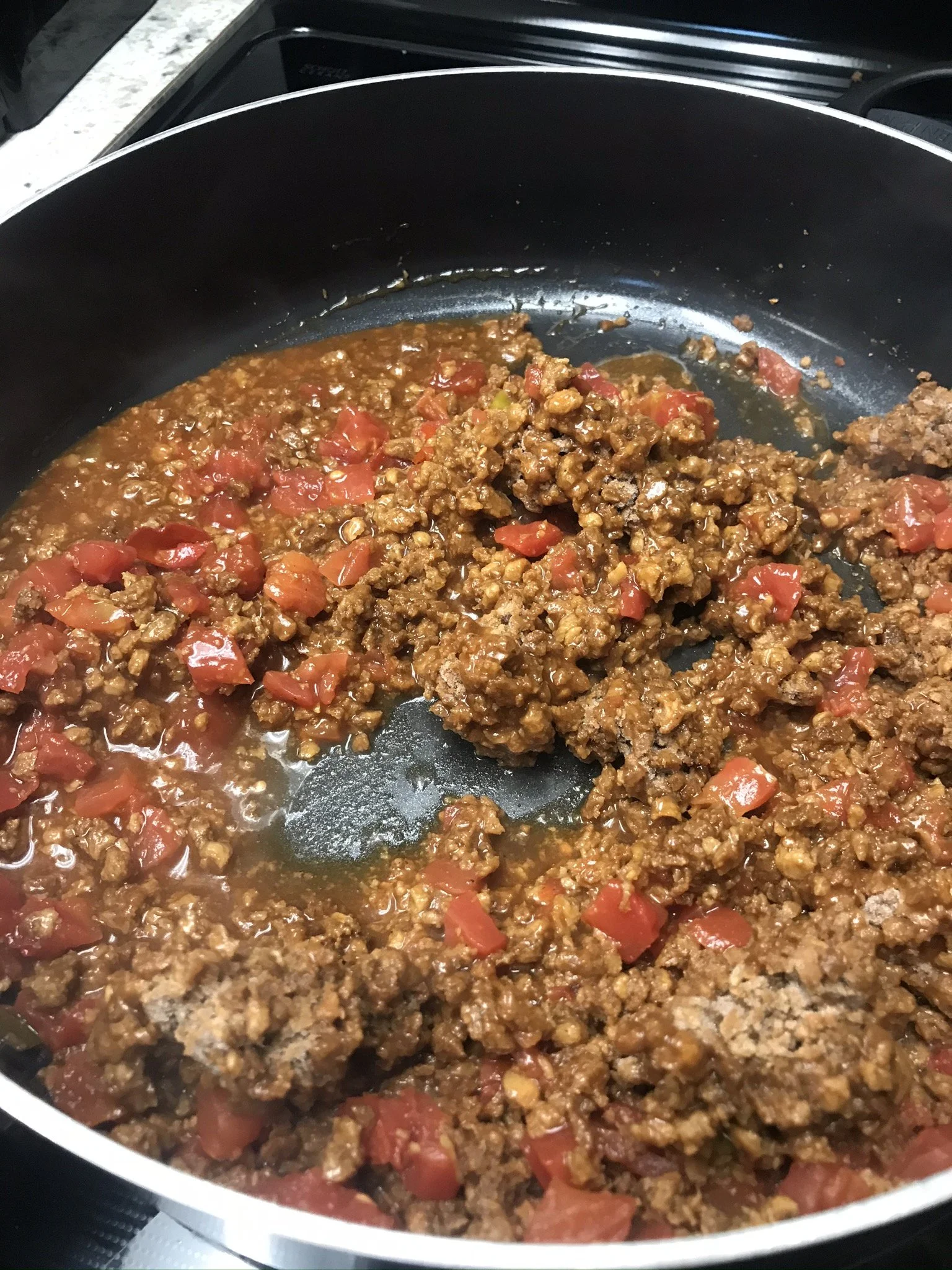 Since the Gardein Plant-Based Ground Beef only takes 3-5 minutes to cook, simply heat up the plant-based beef in a frying pan and dump in the can of Rotel and taco seasoning and mix together. I also added some of the enchilada sauce too but this is optional.