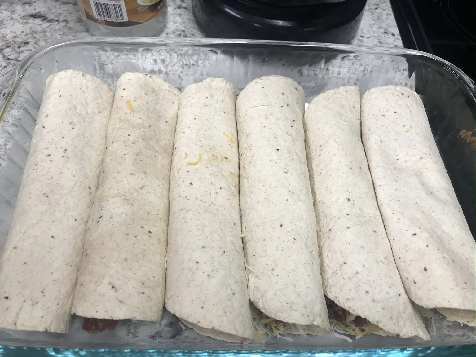 Once it’s ready, put the plant-based beef into the tortillas and sprinkle with the Mexican cheese and roll them up into enchiladas (like a burrito). I used a 9x13 baking dish to make 5-6 large enchiladas.
